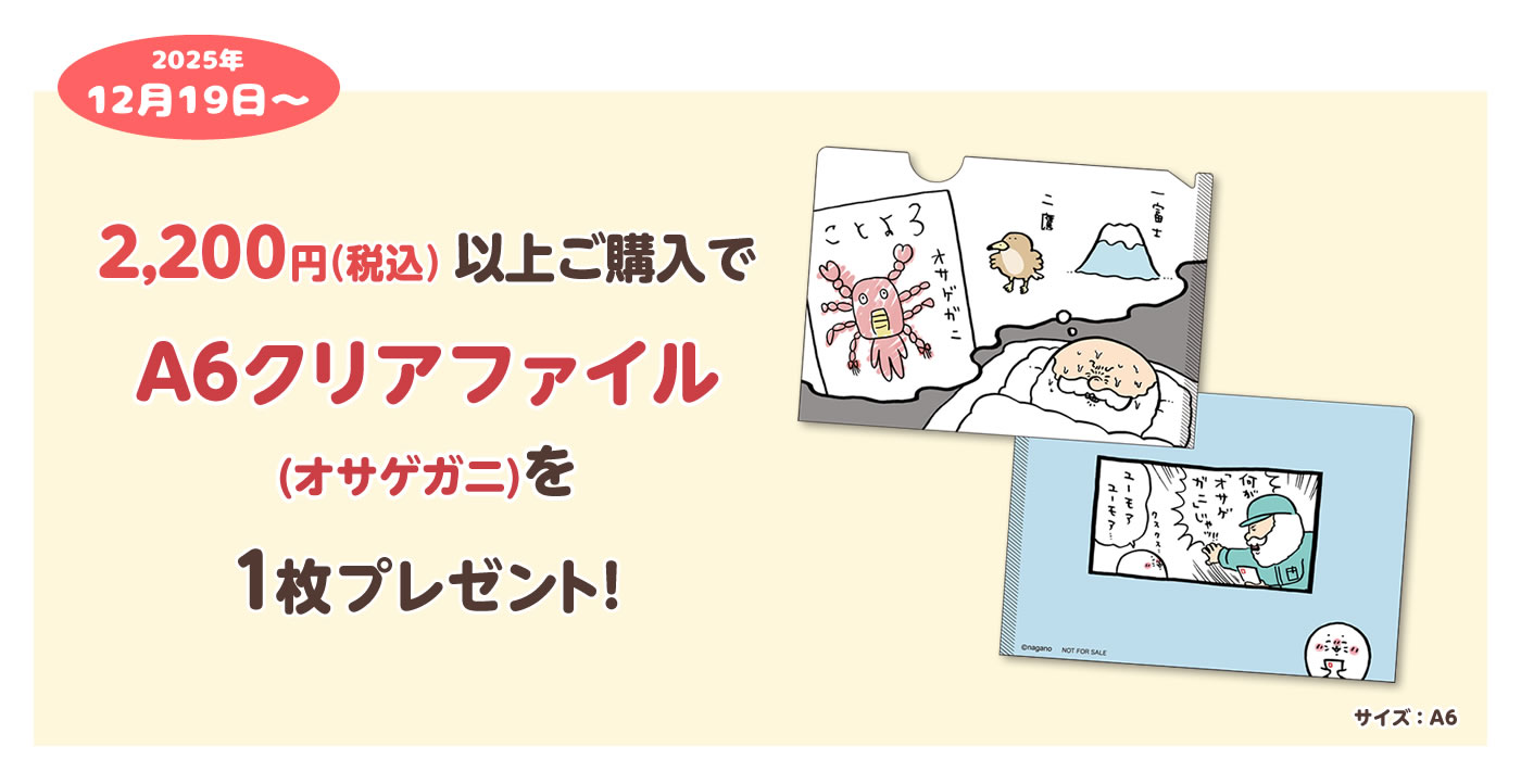 2,200円(税込)以上ご購入でA6クリアファイル(オサゲガニ)を1枚プレゼント!
